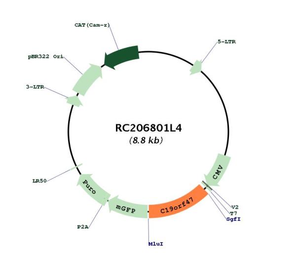 | RG206801 | C19orf47 (tGFP-tagged) - Human chromosome 19 open reading frame 47 (C19orf47) | 10 ug |