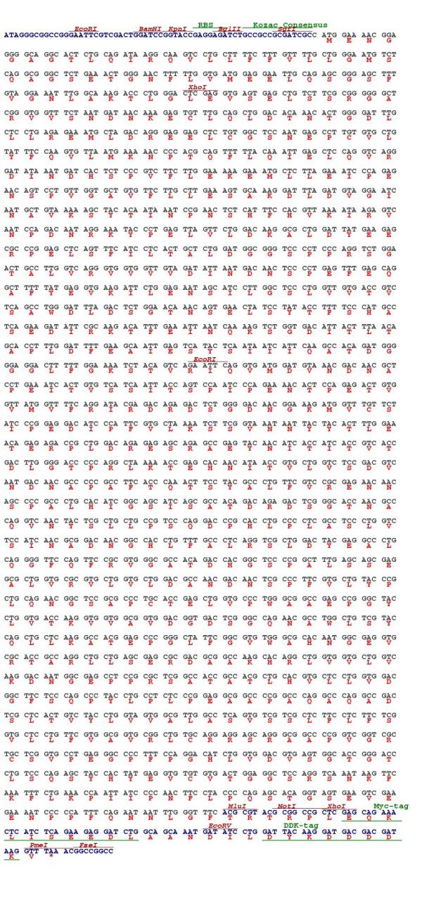 | Reconstitution Method | 1. Centrifuge at 5,000xg for 5min. 2. Carefully open the tube and add 100ul of sterile water to dissolve the DNA. 3. Close the tube and incubate for 10 minutes at room temperature. 4. Briefly vortex the tube and then do a quick spin (less than 5000xg) to concentrate the liquid at the bottom. 5. Store the suspended plasmid at -20°C. The DNA is stable for at least one year from date of shipping when stored at -20°C. |