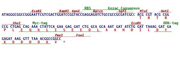 | Reconstitution Method | 1. Centrifuge at 5,000xg for 5min. 2. Carefully open the tube and add 100ul of sterile water to dissolve the DNA. 3. Close the tube and incubate for 10 minutes at room temperature. 4. Briefly vortex the tube and then do a quick spin (less than 5000xg) to concentrate the liquid at the bottom. 5. Store the suspended plasmid at -20°C. The DNA is stable for at least one year from date of shipping when stored at -20°C. |