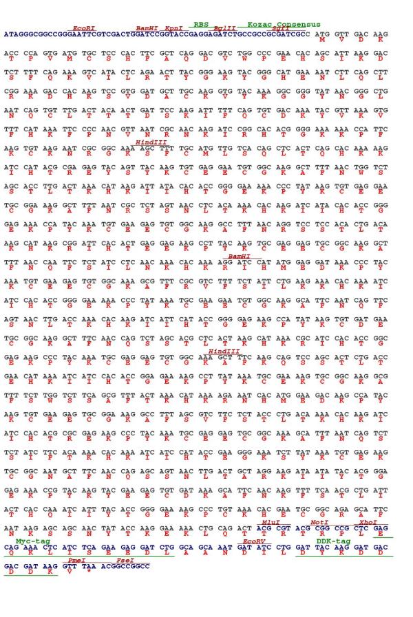 | Reconstitution Method | 1. Centrifuge at 5,000xg for 5min. 2. Carefully open the tube and add 100ul of sterile water to dissolve the DNA. 3. Close the tube and incubate for 10 minutes at room temperature. 4. Briefly vortex the tube and then do a quick spin (less than 5000xg) to concentrate the liquid at the bottom. 5. Store the suspended plasmid at -20°C. The DNA is stable for at least one year from date of shipping when stored at -20°C. |