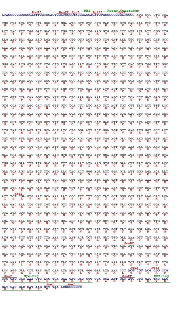 | Reconstitution Method | 1. Centrifuge at 5,000xg for 5min. 2. Carefully open the tube and add 100ul of sterile water to dissolve the DNA. 3. Close the tube and incubate for 10 minutes at room temperature. 4. Briefly vortex the tube and then do a quick spin (less than 5000xg) to concentrate the liquid at the bottom. 5. Store the suspended plasmid at -20°C. The DNA is stable for at least one year from date of shipping when stored at -20°C. |