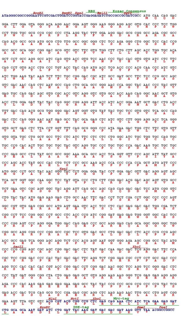| OTI Disclaimer | Due to the inherent nature of this plasmid, standard methods to replicate additional amounts of DNA in E. coli are highly likely to result in mutations and/or rearrangements. Therefore, OriGene does not guarantee the capability to replicate this plasmid DNA. Additional amounts of DNA can be purchased from OriGene with batch-specific, full-sequence verification at a reduced cost. Please contact our customer care team at custsupport@origene.com or by calling 301.340.3188 option 3 for pricing and delivery. The molecular sequence of this clone aligns with the gene accession number as a point of reference only. However, individual transcript sequences of the same gene can differ through naturally occurring variations (e.g. polymorphisms), each with its own valid existence. This clone is substantially in agreement with the reference, but a complete review of all prevailing variants is recommended prior to use. More info |